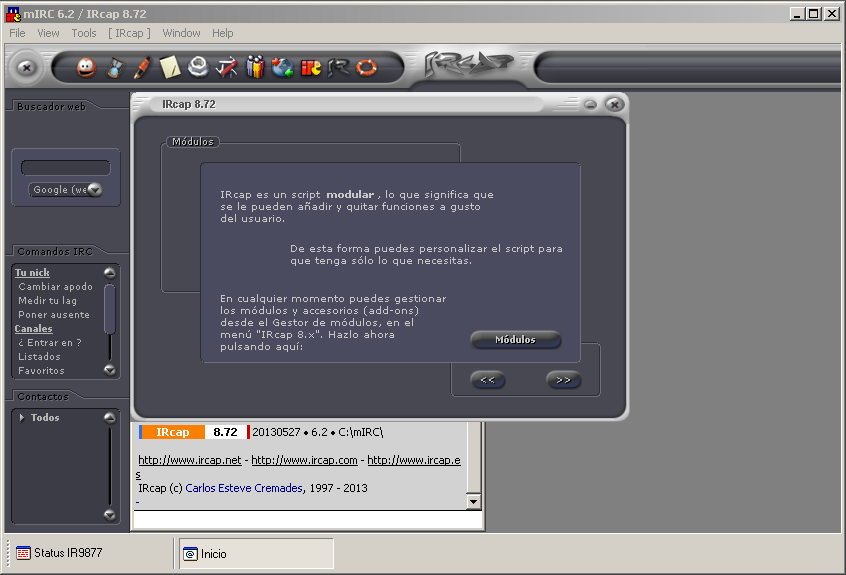 El IRcap es un mod que modifica la apariencia del mIRC, haciéndola más atractiva y sencilla al usuario. Esta instalación es algo más sencilla, pues, además de que está en castellano, cosa que agradecemos los hispanoparlantes, es hacer clic en Instalar, después de escoger el idioma de instalación y aceptar el contrato de licencia.